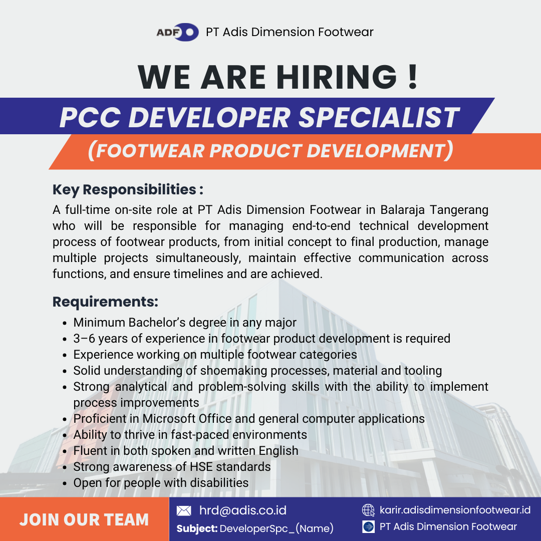 A full-time on-site role at PT Adis Dimension Footwear in Balaraja Tangerang who will be responsible for managing end-to-end technical development process of footwear products, from initial concept to final production, manage multiple projects simultaneously, maintain effective communication across functions, and ensure timelines and are achieved.