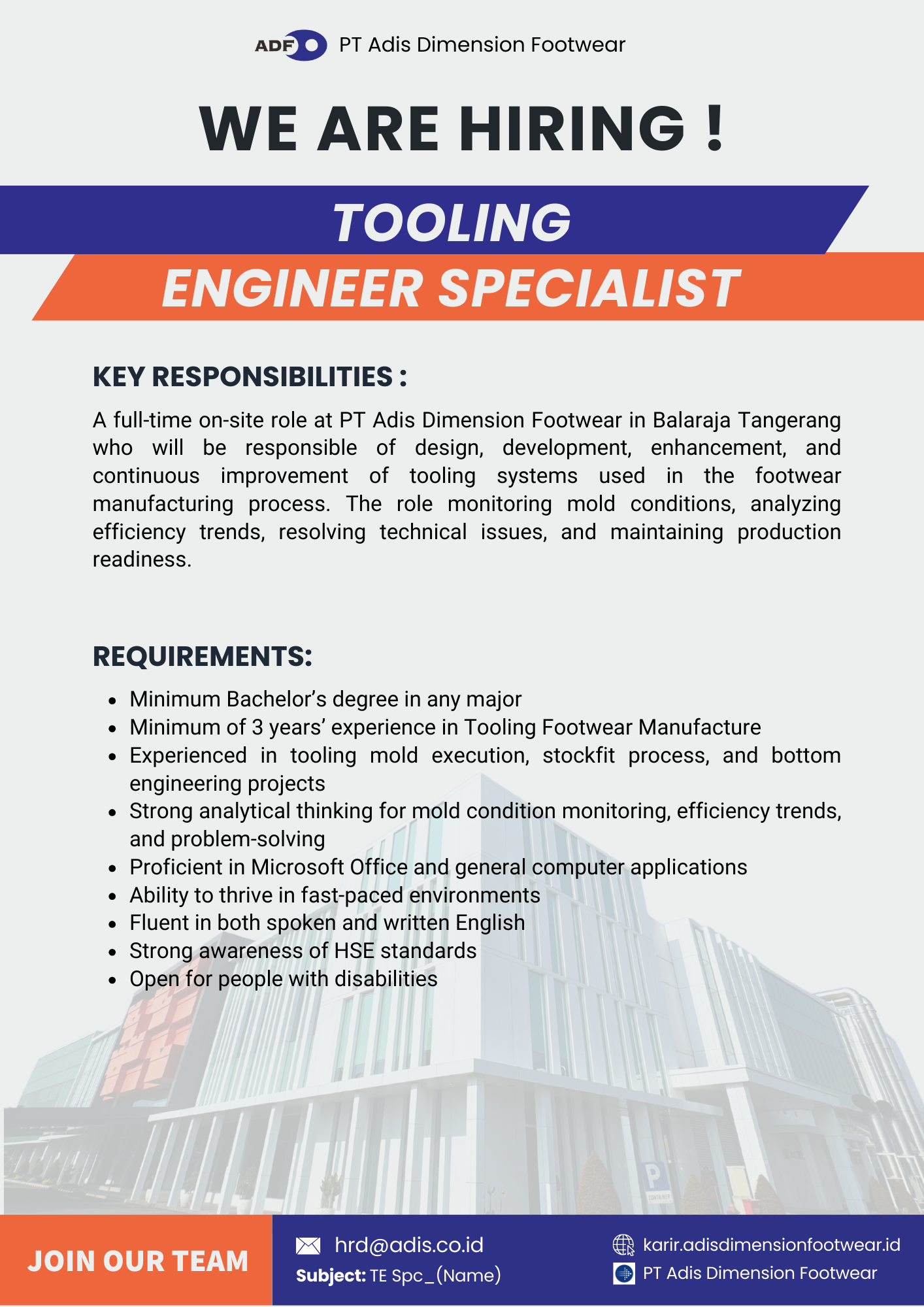 A full-time on-site role at PT Adis Dimension Footwear in Balaraja Tangerang who will be responsible of design, development, enhancement, and continuous improvement of tooling systems used in the footwear manufacturing process. The role monitoring mold conditions, analyzing efficiency trends, resolving technical issues, and maintaining production readiness.